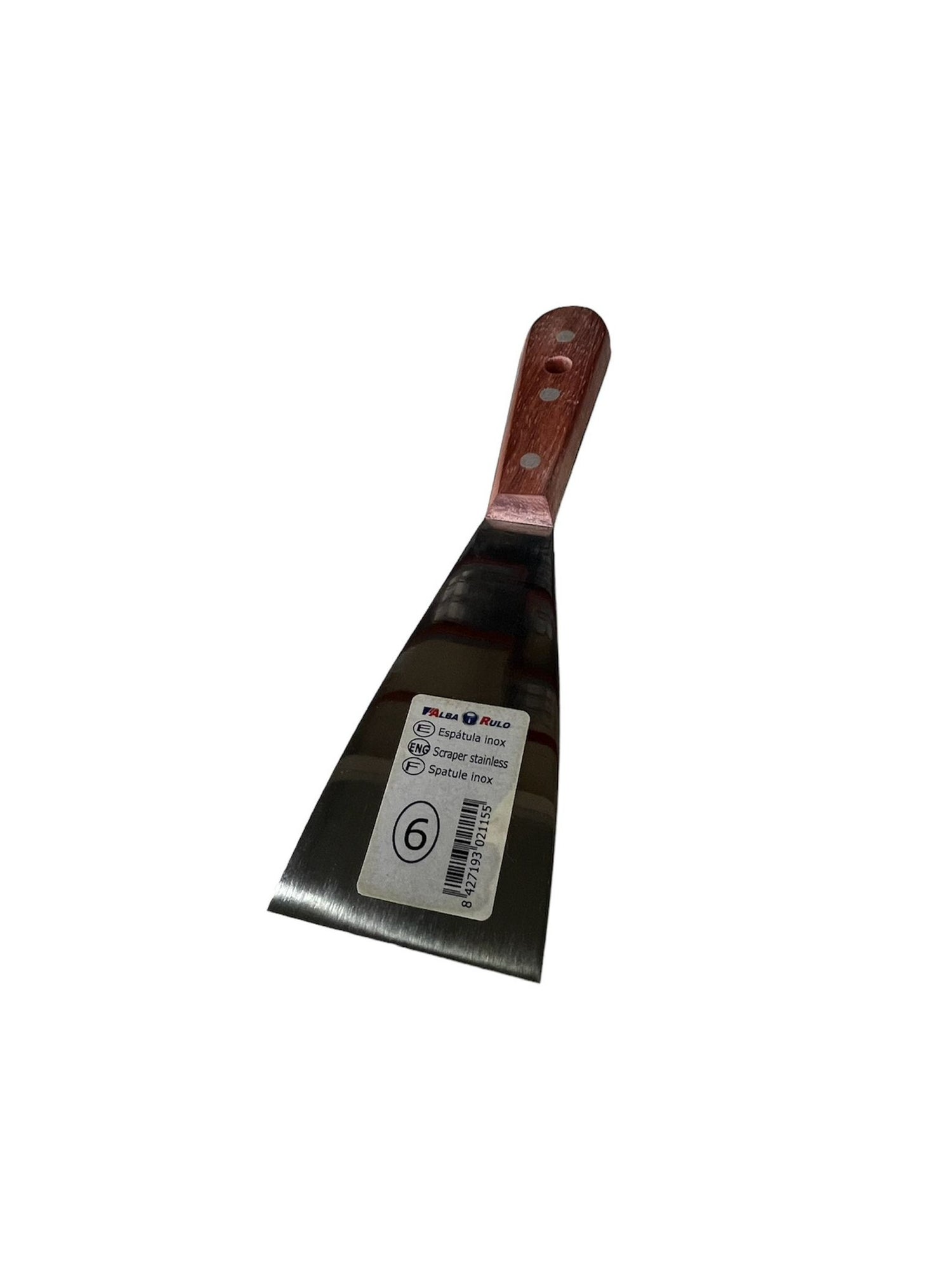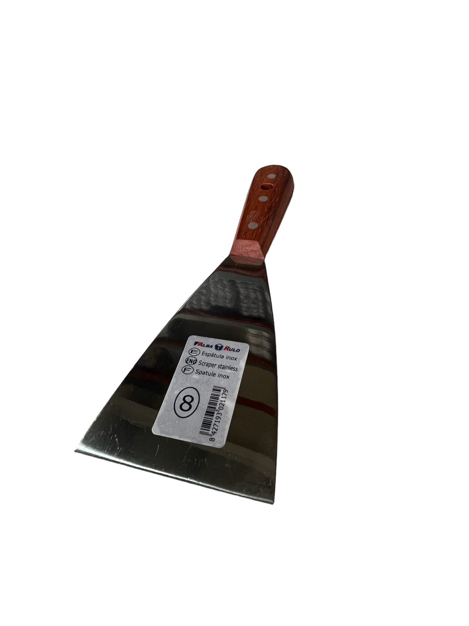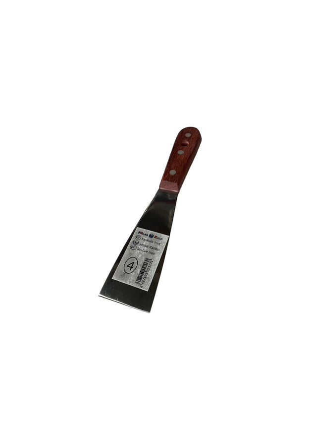 La espátula Master es una herramienta perfecta para la preparación de superficies. Fabricada artesanalmente con una hoja flexible de acero inoxidable europeo de 1,2 mm a 0,6 mm. de espesor, con cantos y boca refinados; presenta un acabado en brillo espejo. Cuenta con un mango de madera tropical y doble remache para una mayor fijación.